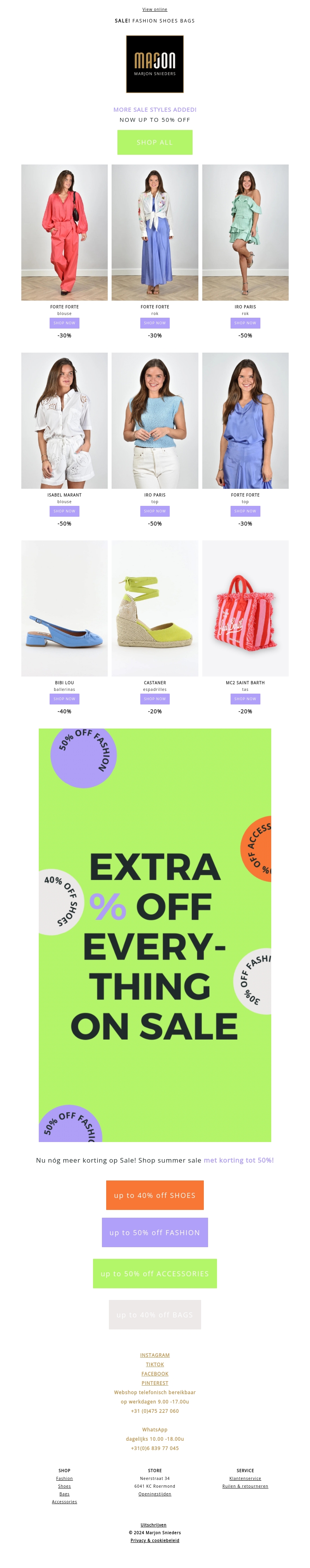 Ontdek de nieuwste sale stijlen met kortingen tot 50%. Mis deze geweldige kans niet om trendy modeartikelen, schoenen, en tassen met korting te scoren. Bezoek nu de winkel en profiteer van de beste deals!