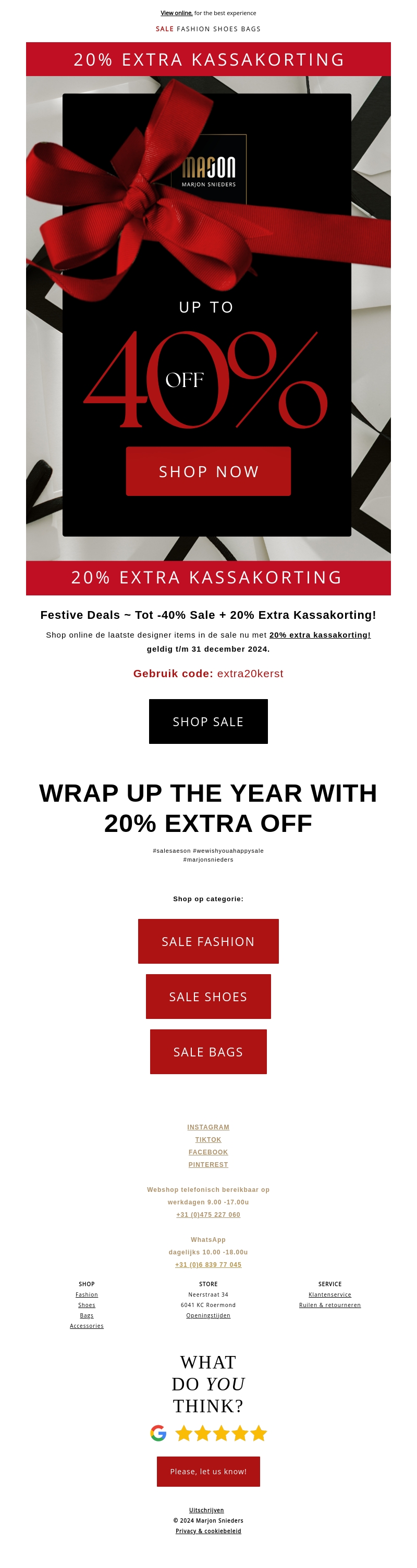 Verwen jezelf met geweldige kortingen in onze sale! Ontdek de nieuwste mode van Marjon Snieders en ontvang nu een extra 20% kassakorting bovenop de sale. Geldig tot en met 31 december 2024. Gebruik de code om te profiteren van deze bijzondere aanbieding.