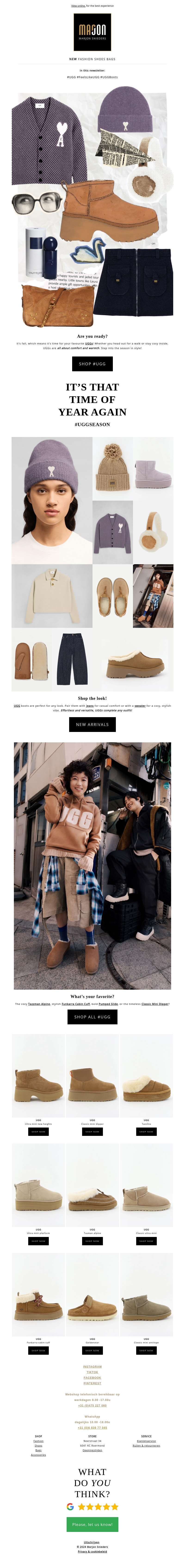 Het is weer die tijd van het jaar waarin comfort en stijl samenkomen met de nieuwste UGG-collectie. Van warme laarzen tot modieuze accessoires, deze nieuwsbrief brengt je de beste deals en stijltips. Bereid je voor op het koude weer en blijf trendy met onze selectie. Daarnaast vind je hier inspirerende looks voor elke gelegenheid. Zorg ervoor dat je niets mist en shop naar hartelust.
