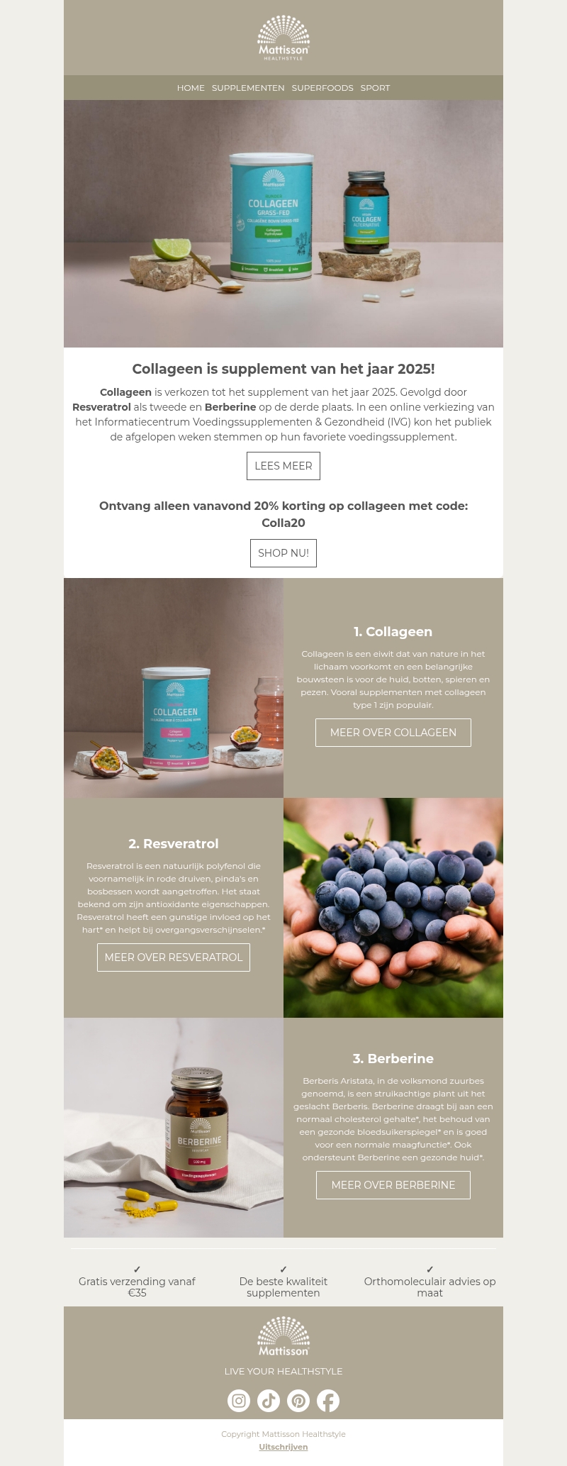 Collageen is uitgeroepen tot het supplement van het jaar 2025. Resveratrol en Berberine volgen als tweede en derde. Lees meer over deze populaire keuzes en profiteer van een speciale korting op collageenproducten. Ontvang alleen vanavond 20% korting met de code Colla20.