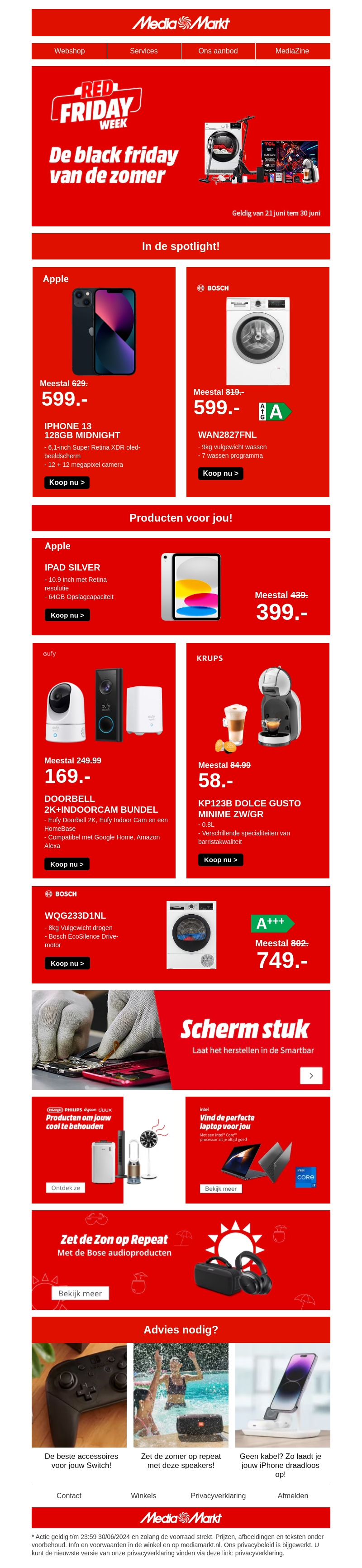 Deze week is het Red Friday Week bij Media Markt! Profiteer van scherpe kortingen op topmerken zoals Apple, Bosch, Eufy, en Krups. Geldig van 21 juni t/m 30 juni. Ontdek nu onze deals en bespaar op je favoriete producten.