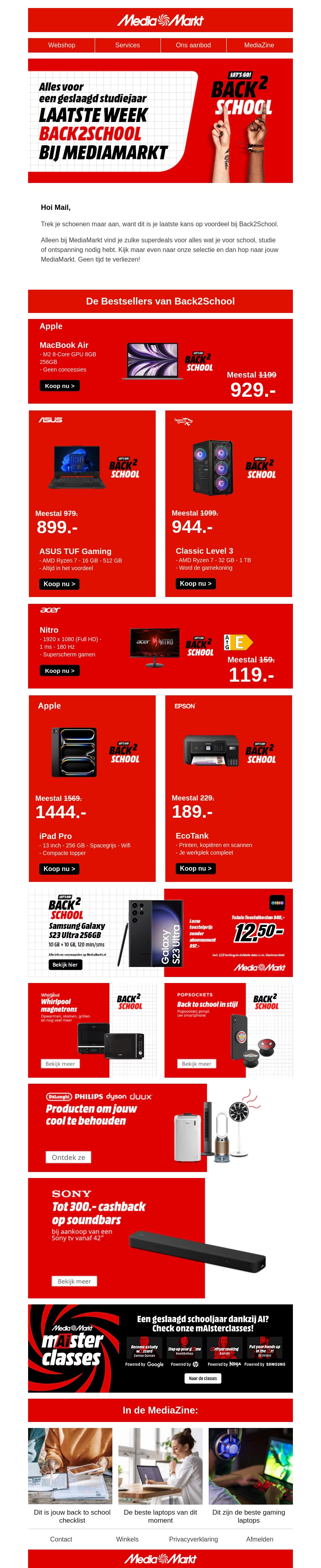 Mis niet je laatste kans op voordeel bij Back2School bij MediaMarkt! Haal tot wel €300 korting op de nieuwste Apple, Samsung en ASUS producten. Ontdek de laatste aanbiedingen voor laptops, tablets en accessoires om jouw studiejaar succesvol te beginnen.