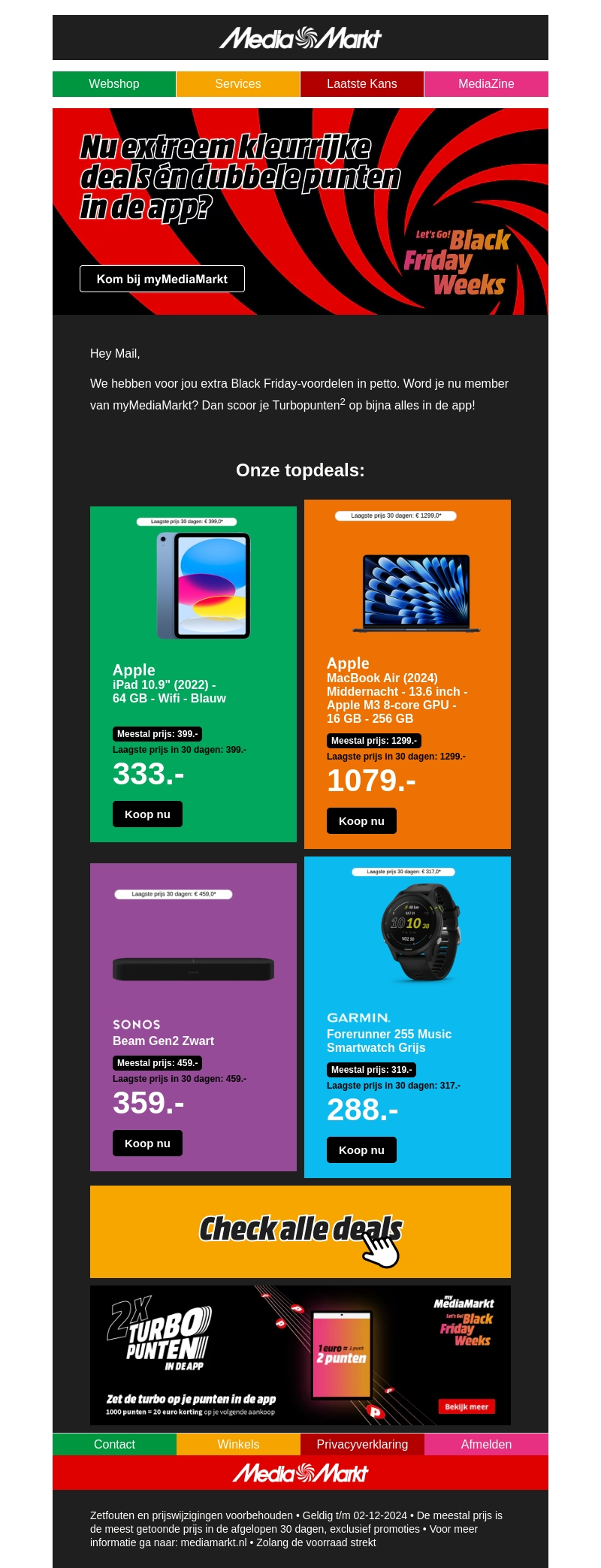 Beleef de spectaculaire Black Friday Weeks bij MediaMarkt met geweldige kortingen. Profiteer nu van exclusieve aanbiedingen op populaire producten zoals Apple iPad en MacBook Air. Verdien dubbele Turbopunten in de app voor nog meer voordeel. Wees snel, want deze deals zijn alleen tijdelijk beschikbaar!