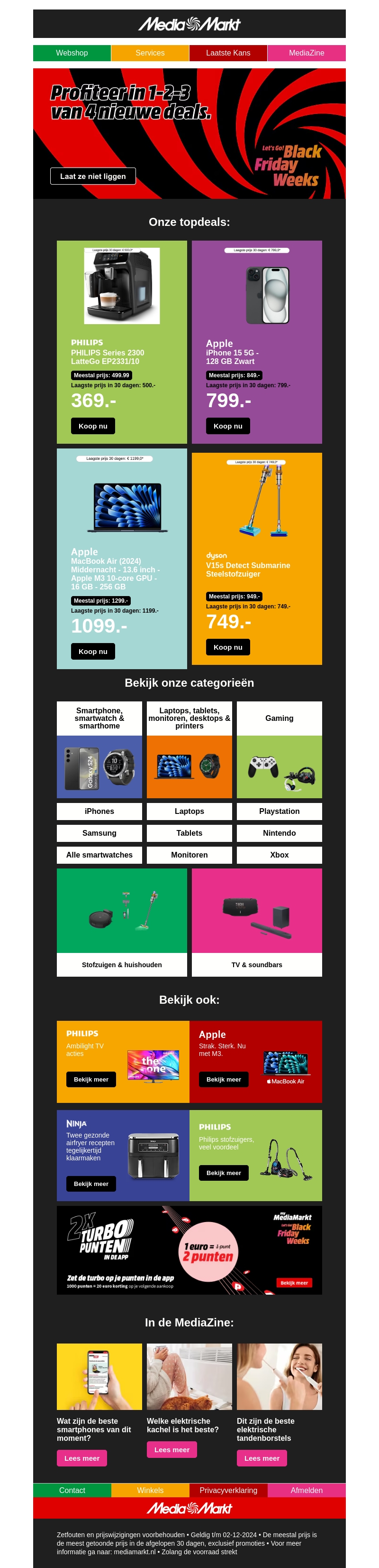 Vier Black Friday het hele weekend met MediaMarkt's nieuwste aanbiedingen. Ontdek vier geweldige deals op topmerken zoals Apple en Philips, met spectaculaire kortingen op smartphones, laptops en huishoudelijke apparaten. Mis deze exclusieve kans niet om jouw favoriete producten tegen ongekende prijzen te bemachtigen. Bezoek onze webshop of kom langs in de winkel en profiteer van 1-2-3 van vier nieuwe deals.