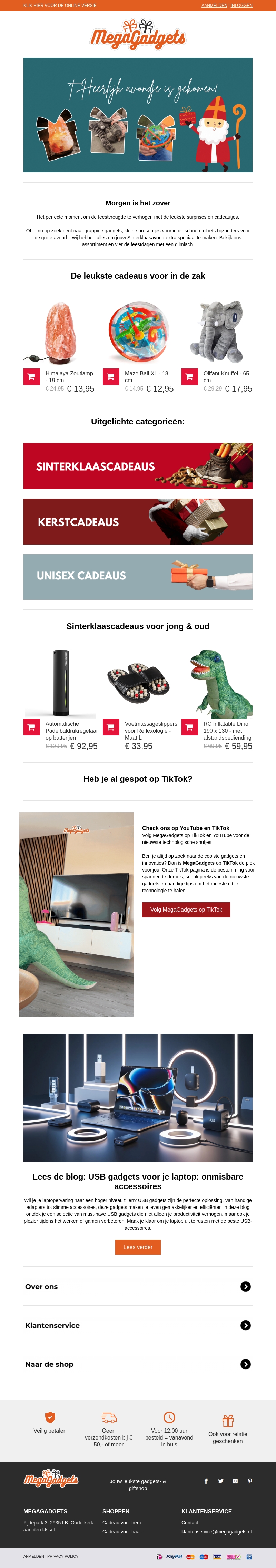 Het heerlijk avondje is gekomen bij MegaGadgets met de meest unieke cadeaus. Van verrassende Sinterklaascadeaus tot leuke gadgets voor jong en oud, er is voor ieder wat wils. Bekijk onze speciale selectie Sinterklaascadeaus die ideaal zijn voor in de zak. Plus, ontdek ook onze Kerstcadeaus en unisex opties die perfect zijn voor de feestdagen. Mis ook de nieuwste trends op TikTok niet en lees onze blog voor must-have USB gadgets.