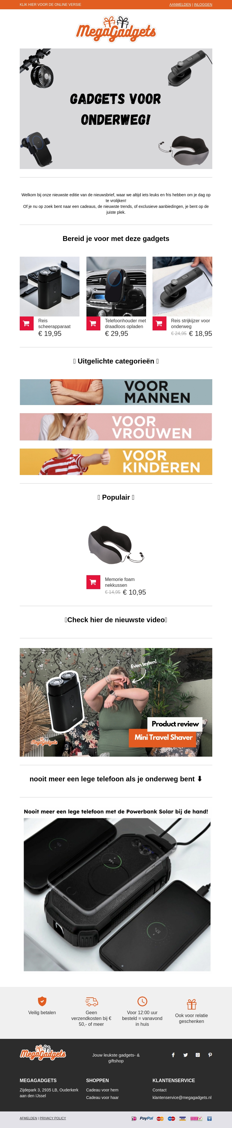 Welkom bij de nieuwste editie van de MegaGadgets nieuwsbrief! Ontdek de beste gadgets voor onderweg, speciaal geselecteerd om je reis comfortabeler te maken. Of je nu op zoek bent naar een reisscheerapparaat, telefoonhouder of een nekkussen, wij hebben het allemaal. Bekijk ook onze uitgelichte categorieën voor mannen, vrouwen en kinderen. Mis onze nieuwe video niet en zorg ervoor dat je altijd een opgeladen telefoon hebt met onze Powerbank Solar.