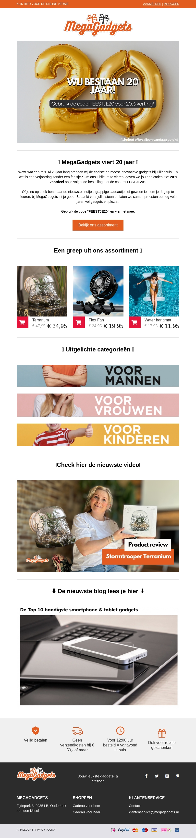 π MegaGadgets bestaat 20 jaar, ontvang alleen vandaag 20% voordeel op onze gehele collectie π