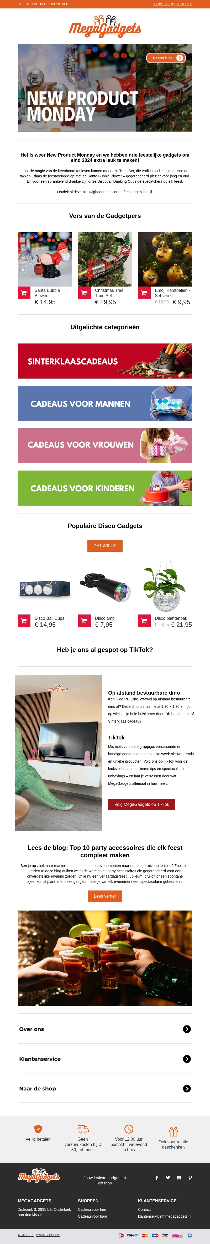 Het is weer New Product Monday bij MegaGadgets, en we hebben de leukste en nieuwste gadgets om het jaar feestelijk af te sluiten. Denk aan kerstcadeaus voor mannen, vrouwen, en kinderen. Ontdek populaire producten zoals de afstand bestuurbare dino en de nieuwste TikTok-trends. Maak je feest compleet met onmisbare party accessoires.