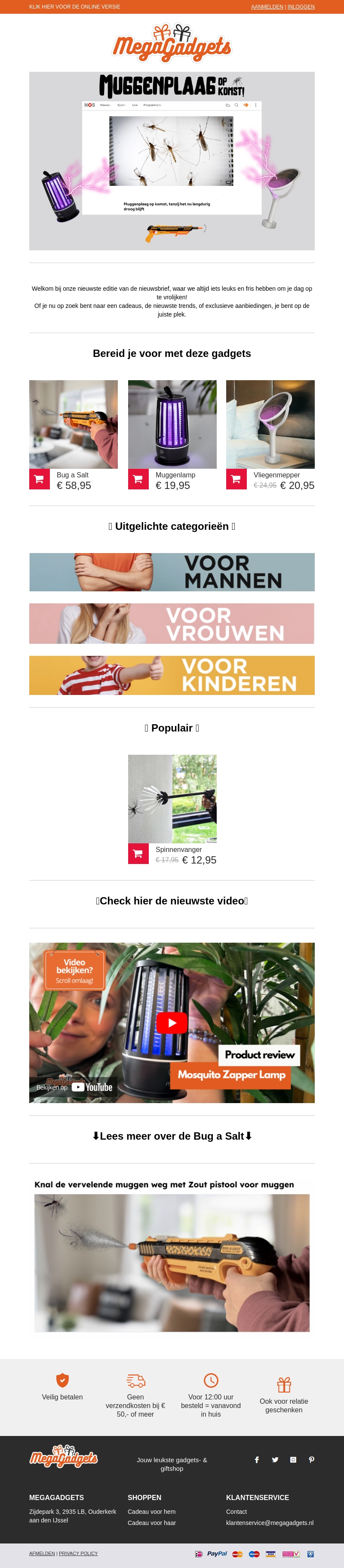 Welkom bij onze nieuwste nieuwsbrief. Bereid je voor op de naderende muggenplaag met onze zorgvuldig uitgekozen gadgets. Van muggenlampen tot vliegmepper gadgets, wij hebben alles wat je nodig hebt om de zomer muggenvrij door te komen. Bekijk onze populaire producten en speciale aanbiedingen nu!