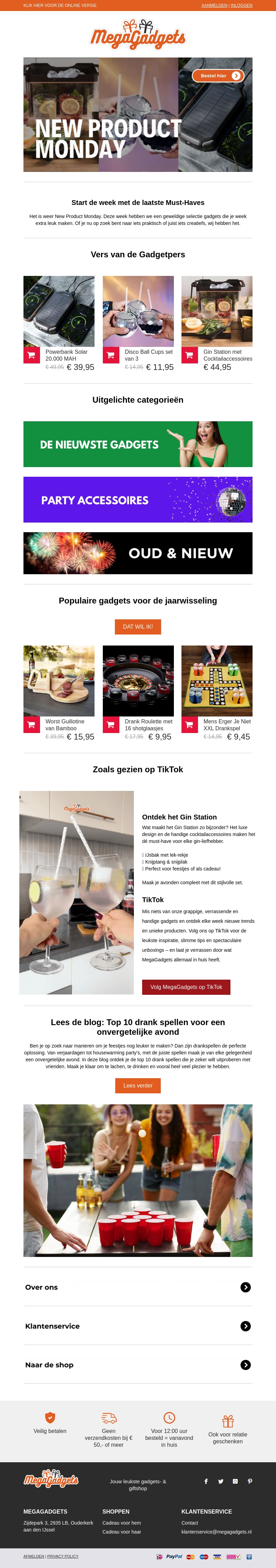 Begin de week met de nieuwste gadgets en must-haves. MegaGadgets presenteert 'New Product Monday', met een selectie van producten die niet mogen ontbreken. Van draagbare opladers tot feestelijke accessoires voor elke gelegenheid. Bekijk de aanbiedingen van deze week en mis niets. Ontdek daarnaast onze top 10 drankspellen voor een unieke avond.