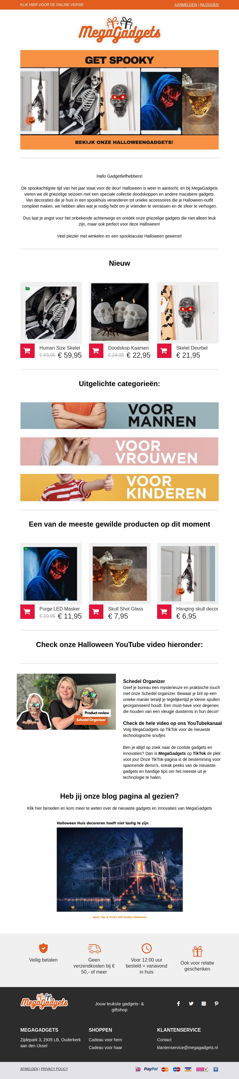 Halloween staat voor de deur en MegaGadgets heeft de perfecte gadgets en decoratie voor een spooktastisch feest. Denk aan menselijke skeletten, doodskop kaarsen en masker voor een mysterieuze touch. Bekijk ook onze exclusieve kortingsdeals en ontdek het complete assortiment speciaal voor deze griezelige tijd van het jaar.