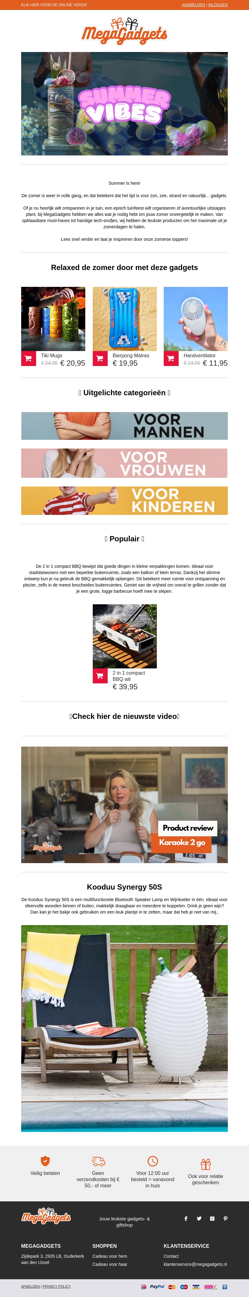De zomer is in volle gang en MegaGadgets heeft de perfecte gadgets voor een ontspannen en leuke zomer. Van tike mokken en bierpong matras tot handventilatoren en de 2 in 1 compact BBQ. Mis onze nieuwste video review niet en bekijk de multifunctionele Kooduu Synergy 50S voor binnen en buiten gebruik. Veel plezier en geniet van de zomer!
