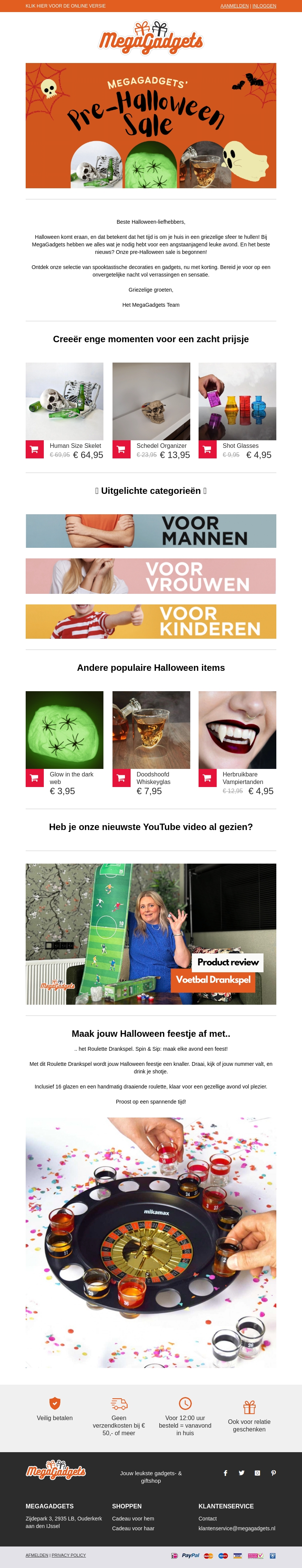 Halloween is bijna hier en MegaGadgets helpt je om het griezeligste feest ooit te maken. Van skeletten tot shotglazen, wij hebben alles om je feest compleet te maken. Bekijk nu onze aanbiedingen en pak je voordeel!