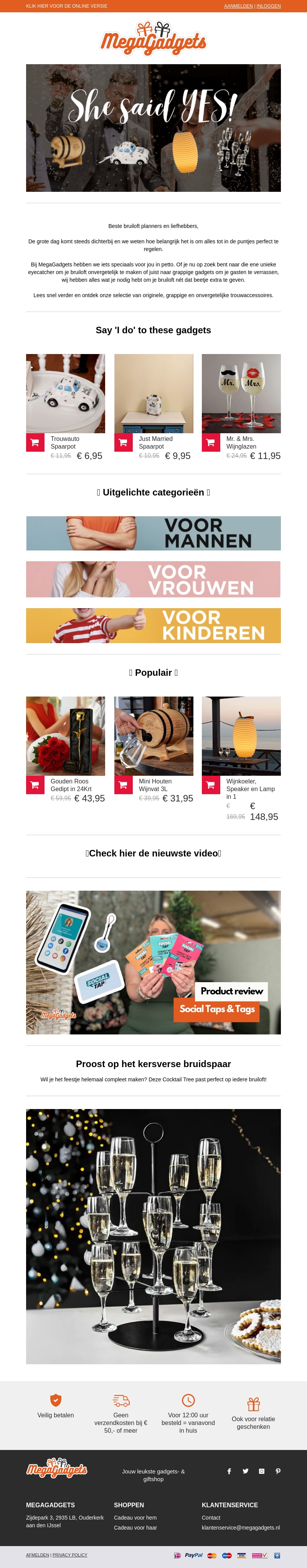 De grote dag komt dichterbij en bij MegaGadgets hebben we alles wat je nodig hebt om jouw bruiloft speciaal te maken. Van originele trouwaccessoires tot grappige gadgets, wij hebben het allemaal. Bekijk onze selectie en zeg 'ja' tegen deze must-have bruiloft gadgets. Laat je inspireren en maak jouw bruiloft onvergetelijk.