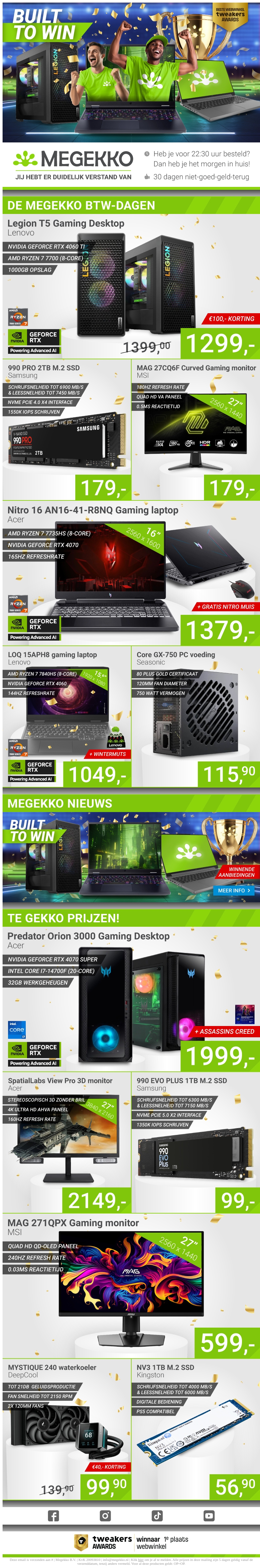 De Megekko BTW-dagen zijn hier met waanzinnige kortingen op een breed scala aan gaming desktops, laptops en accessoires. Profiteer van prijsverlagingen op topmerken zoals Lenovo en Acer, inclusief NVIDIA GeForce RTX grafische kaarten en krachtige AMD of Intel-processors. Dit is jouw kans om je gaming-uitrusting naar een hoger niveau te tillen! Bestel nu en geniet van de beste deals.