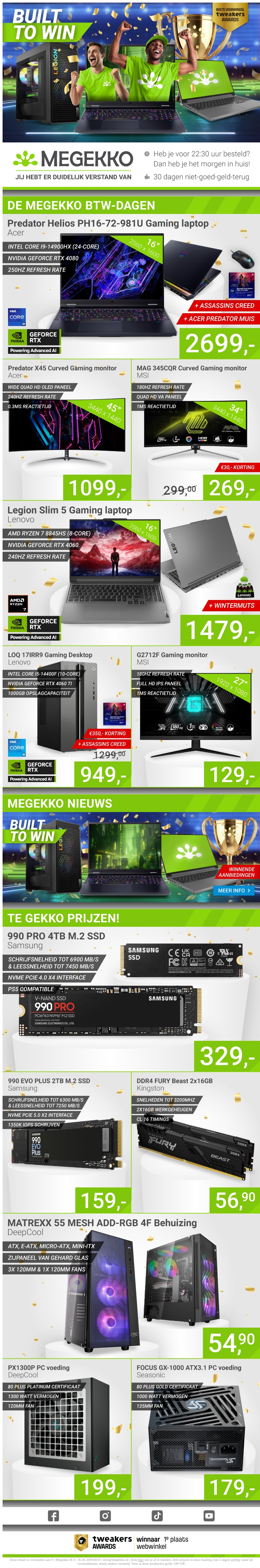 De Megekko BTW-dagen zijn begonnen met spectaculaire kortingen op een breed scala aan elektronica. Van krachtige gaming laptops tot ultramoderne monitors, er zijn deals die je niet wilt missen. Elke aankoop komt met de bekende Megekko garantie op kwaliteit en snelheid van levering. Mis deze kans niet om je tech-setup naar een hoger niveau te tillen. Shop nu en ervaar de voordelen van de Megekko-dagen!