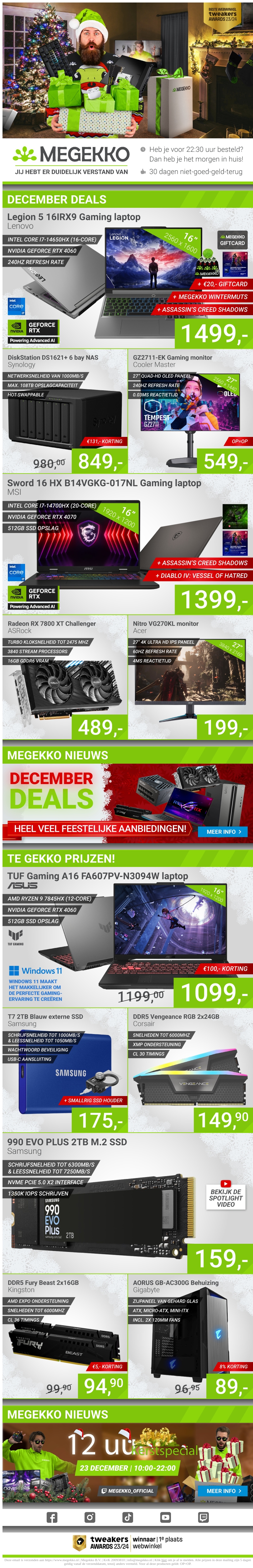 Stort je in onze spectaculaire December deals! Of je nu op zoek bent naar een krachtige gaming laptop, een scherpe monitor, of supersnelle SSD-opslag, wij hebben het allemaal. Profiteer van kortingen en ontvang bonussen zoals giftcards en extra accessoires. Mis onze exclusieve winteraanbiedingen niet en maak je december nog specialer met Megekko. Ontdek nu de beste prijzen van het seizoen.
