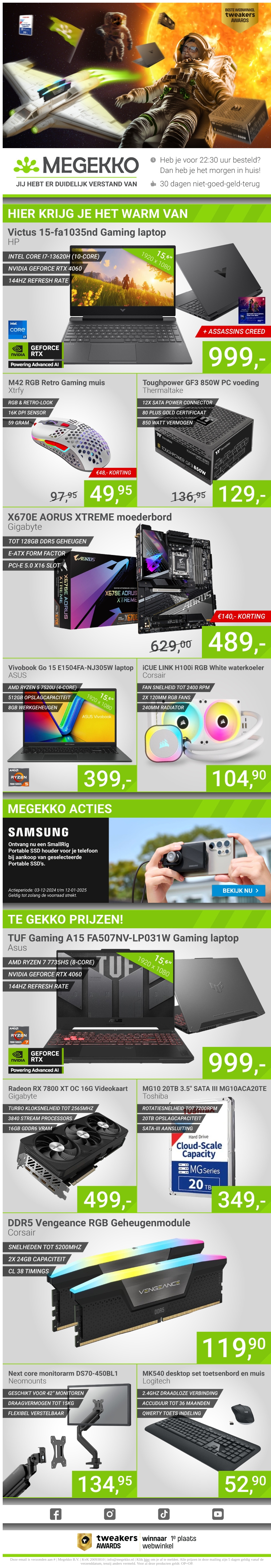 Duik in de nieuwste aanbiedingen van Megekko en vind geweldige deals op laptops, gaming-apparatuur en meer. Ontdek de Victus Gaming laptop met indrukwekkende specificaties en veel korting. Bovendien zijn er speciale Megekko acties, zoals kortingen op Samsung SSD's. Bekijk de selectie nu en profiteer van scherpe prijzen.