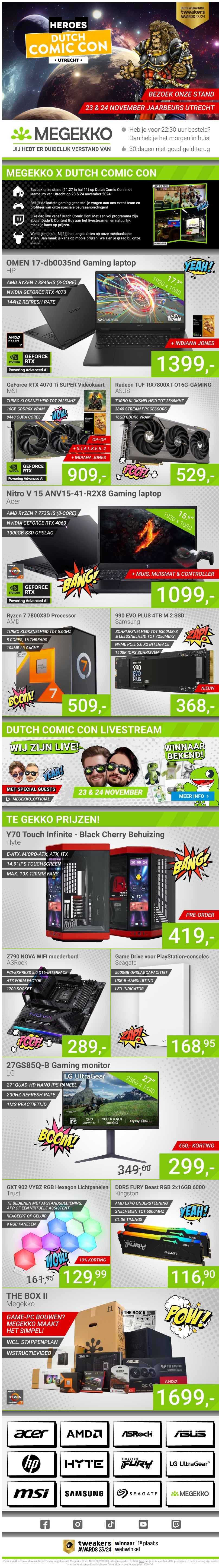 Bezoek Megekko op Dutch Comic Con en profiteer van geweldige tech-aanbiedingen. Van krachtige gaming laptops tot essentiële pc-componenten, er is voor ieder wat wils. Speciale promoties, zoals de Omen 17 gaming laptop en de Radeon TUF RX6700XT, brengen je naar het volgende level. Kijk uit naar spectaculaire kortingen en exclusieve pre-orders. Vergeet niet om onze stand te bezoeken voor live shows en prijzen.