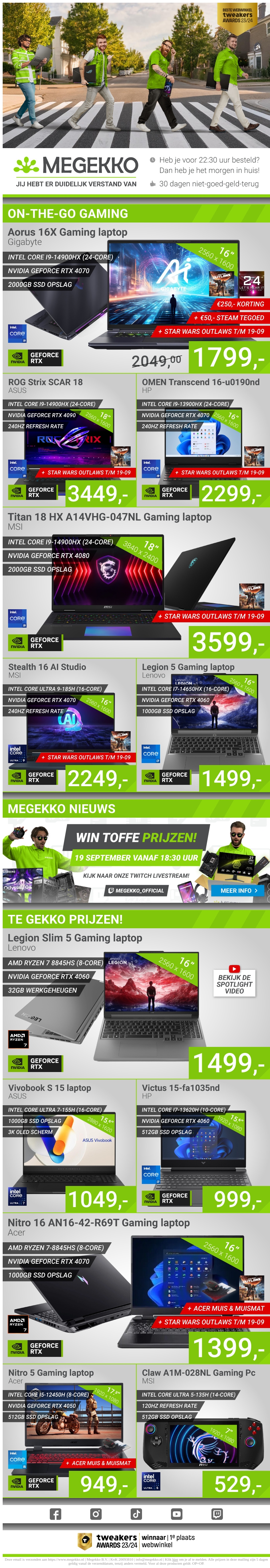 Bekijk nu de nieuwste gaming laptops voor onderweg bij Megekko! Van de krachtige Aorus 16X tot de stijlvolle Stealth 16 AI, er is voor ieder wat wils. Profiteer van exclusieve kortingen en win toffe prijzen. Mis het niet!
