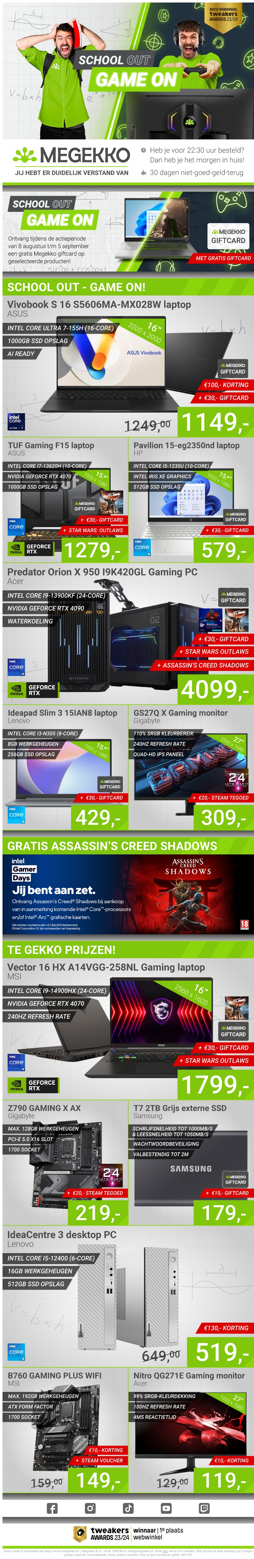 Bereid je voor op het nieuwe schooljaar met de beste gaming-deals van Megekko. Van laptops tot gaming-PC's, we hebben alles voor jouw game-ervaring. Profiteer nu van gratis giftcards bij aankoop en tijdelijke kortingen. Mis het niet!