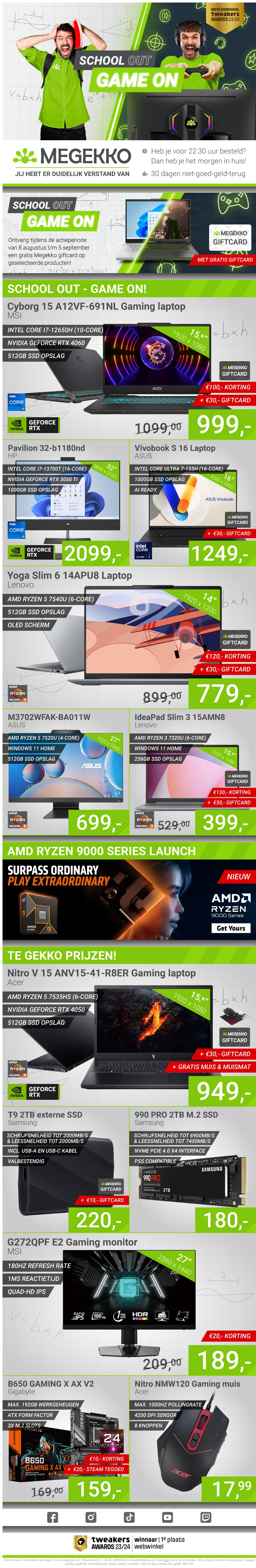 Mis deze te gekke 'School Out - Game On' aanbiedingen niet! Ontdek geweldige prijzen op gaming laptops, monitors, SSD's en accessoires. Haal meer uit je schoolvakantie en game nu met de beste hardware en kortingen.