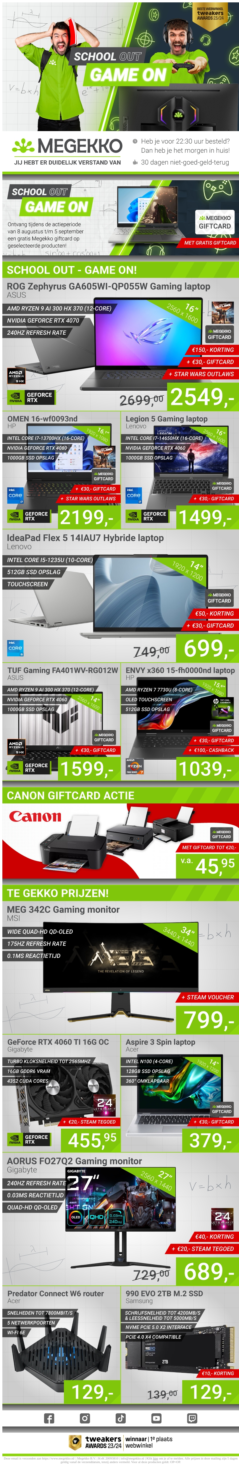 De vakantie is begonnen en het is tijd om te gamen! Bij Megekko vind je geweldige aanbiedingen voor gaming laptops, monitors en accessoires. Mis deze kans niet om je setup te upgraden voor de beste prijzen. Bekijk onze nieuwste deals en krijg ook cadeaubonnen bij aankoop van geselecteerde producten.