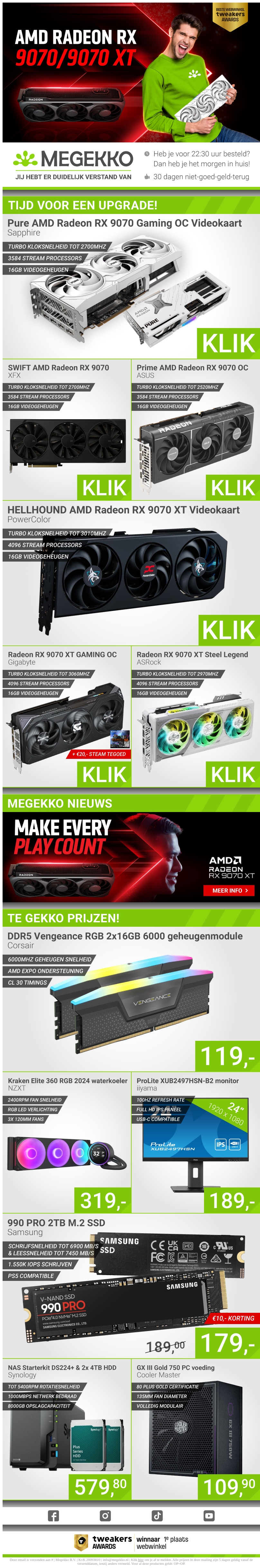 Deze nieuwsbrief presenteert de nieuwste AMD Radeon RX 9700 en 9700 XT videokaarten, ideaal voor gamers die hun systeem willen upgraden. Profiteer van voordeelprijzen op diverse hardware waaronder de DDR5 Vengeance RGB-modules. Kijk ook naar de Kraken Elite 360 RGB waterkoeler voor optimale prestaties. Vergeet niet onze promotie van €10 korting op de Samsung 990 PRO SSD.
