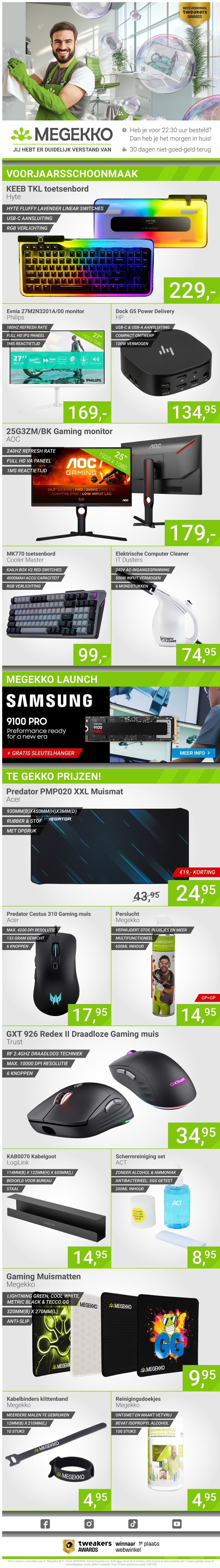 Megekko presenteert de voorjaarsschoonmaak met geweldige kortingen op allerlei tech-producten. Van toetsenborden en monitors tot gaming muizen en bureaumatten, er is voor ieder wat wils. Profiteer van de scherpe prijzen en bereid je voor op een frisse start van het seizoen. Of je nu een gamer bent of op zoek naar computeraccessoires, Megekko heeft het allemaal. Mis deze kans niet om te besparen op topkwaliteit producten. Shop nu en geniet van de lente met Megekko!