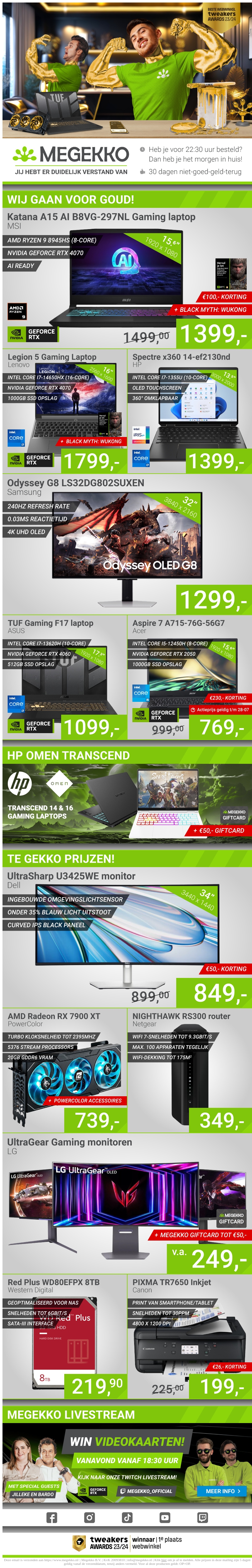Megekko presenteert de nieuwste kortingen op een breed scala aan technologieproducten. Van krachtige gaming laptops tot scherpe monitoren, er is voor ieder wat wils. Profiteer van exclusieve kortingen en speciale acties. Bekijk nu de volledige nieuwsbrief voor alle aanbiedingen!