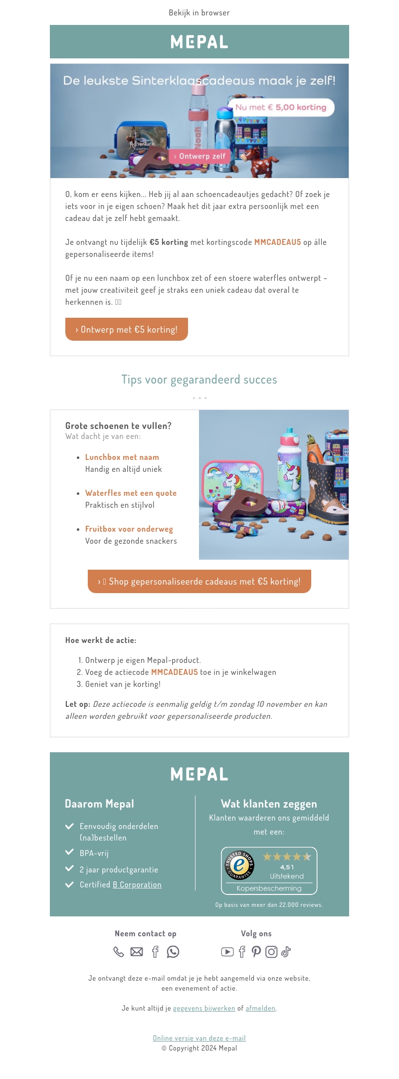 Verwen jezelf en anderen met unieke Sinterklaascadeaus van Mepal. Ontvang tijdelijk β¬5 korting met kortingscode MMCADEAU5. Kies uit een gepersonaliseerde lunchbox, drinkfles met quote, of kleurrijke fruitbox. Ontwerp nu het perfecte cadeau en geniet van de feestdagen.