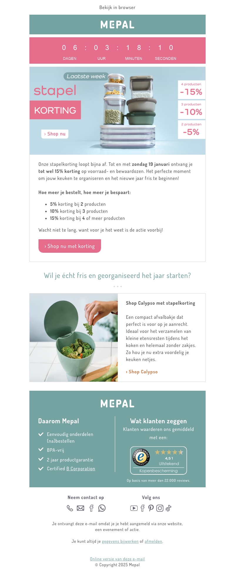 Profiteer deze week nog van onze speciale kortingen op voorraad- en bewaardozen. Ontvang tot 15% korting afhankelijk van het aantal producten dat je koopt. Ideaal om je keuken fris en georganiseerd te beginnen in het nieuwe jaar. Deze aanbieding is geldig tot en met zondag 19 januari. Mis deze kans niet om je favoriete keukenartikelen voordelig aan te schaffen!