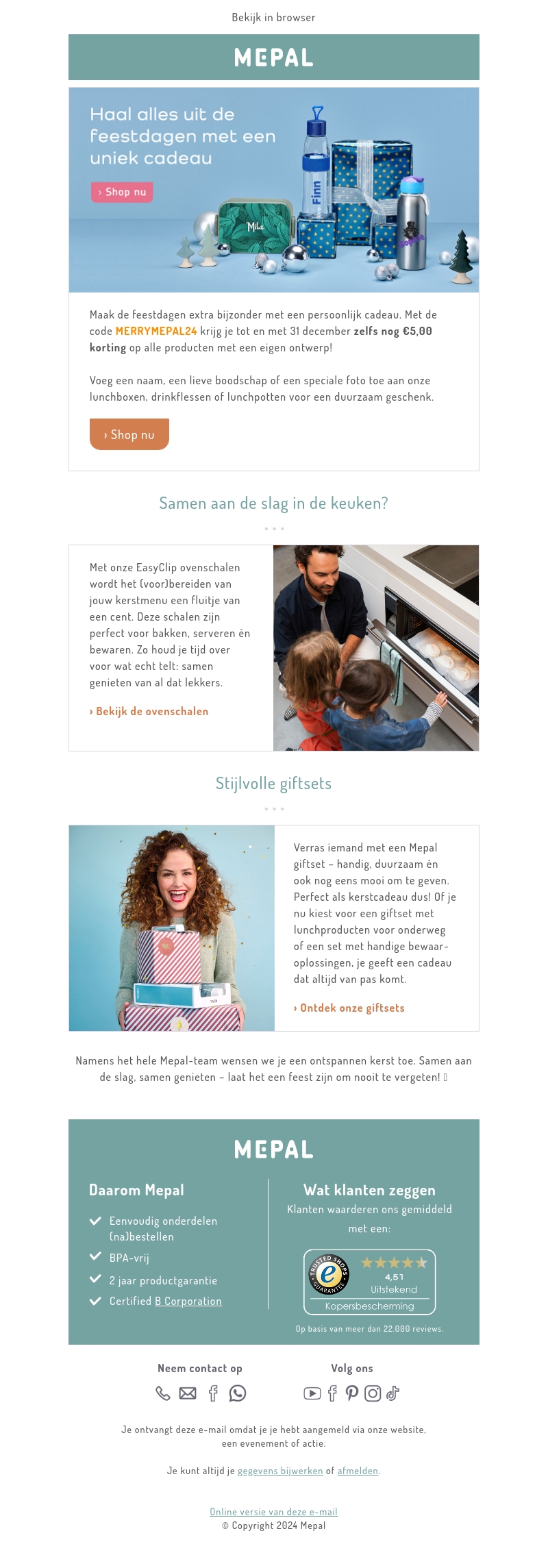 Maak de feestdagen extra speciaal met gepersonaliseerde cadeaus van Mepal. Met de code MERRYMEPAL24 krijgt u tot en met 31 december β¬5,00 korting op alle producten met een eigen ontwerp. Bekijk onze EasyClip ovenschaal voor een eenvoudig kerstmenu en stijlvolle giftsets voor iedereen. Verras iemand met een Mepal en maak deze kerst onvergetelijk!