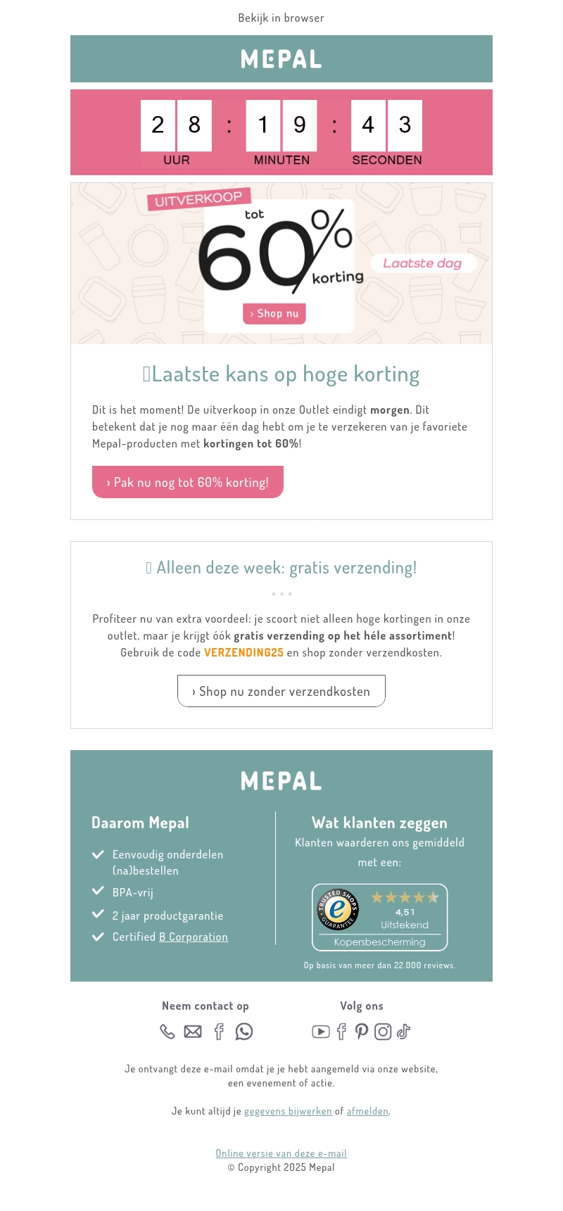 Mis het niet! De grote uitverkoop bij Mepal eindigt morgen. Profiteer nu van kortingen tot wel 60% op je favoriete producten! Gebruik de code VERZENDING25 voor gratis verzending.