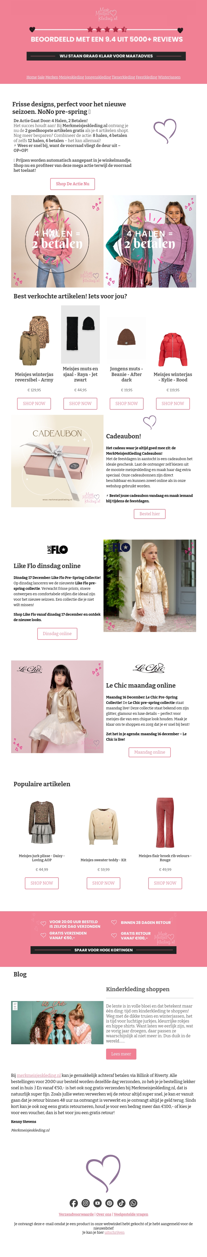 Ontdek de nieuwste en frisse NoNo pre-spring collectie met een geweldige aanbieding: 4 halen, 2 betalen. Grijp je kans nu de voorraad nog strekt. Vind stijlvolle en comfortabele mode voor meisjes, perfecte voor het aankomende seizoen. Mis deze unieke kans niet en verras je kleintje met de mooiste outfits. Shop snel en geniet van de beste deals!