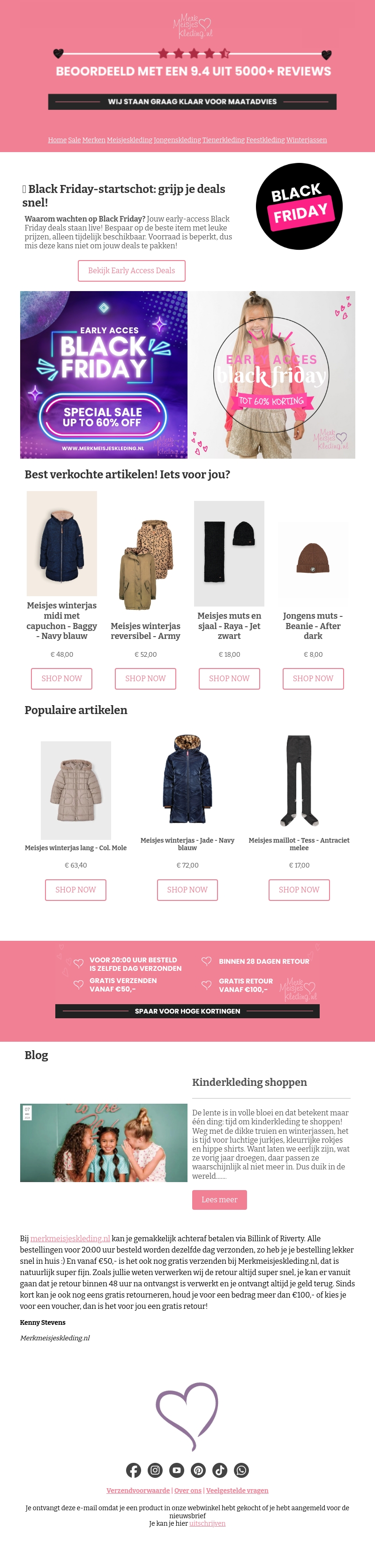 De Black Friday sale is begonnen bij Merkmeisjeskleding.nl met kortingen tot 60%. Profiteer van exclusieve aanbiedingen en koop de meest populaire artikelen. Bestel voor 20:00 en ontvang jouw bestelling nog dezelfde dag. Gratis verzending vanaf β¬50 en eenvoudig retourneren. Mis deze kans niet en shop jouw favorieten!