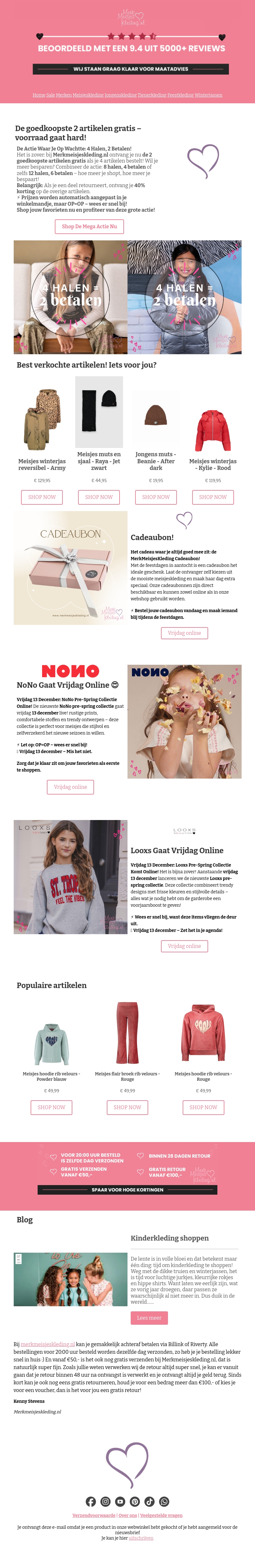 Maak nu gebruik van de Mega Deal: 4 artikelen halen, maar slechts voor 2 betalen. Deze actie geldt op de merken NonO en Looxs. Voorraad gaat snel, dus mis het niet! Shop nu de populairste winterkleding voor meisjes en jongens. Profiteer van gratis verzending en een 30 dagen retourbeleid.