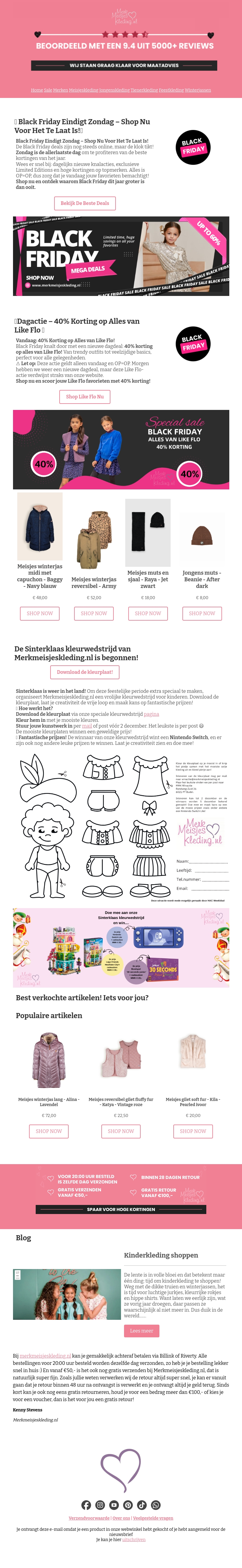 Verwen je kleintjes met stijlvolle kleding van Like Flo en profiteer van een fantastische 40% korting. Deze aanbieding is onderdeel van de Black Friday deals en geldt op alle artikelen van Like Flo. Van warme winterjassen tot schattige mutsjes, er is iets voor elk kind. Shop nu en maak gebruik van deze geweldige kans voor topkwaliteit kindermerkkleding.