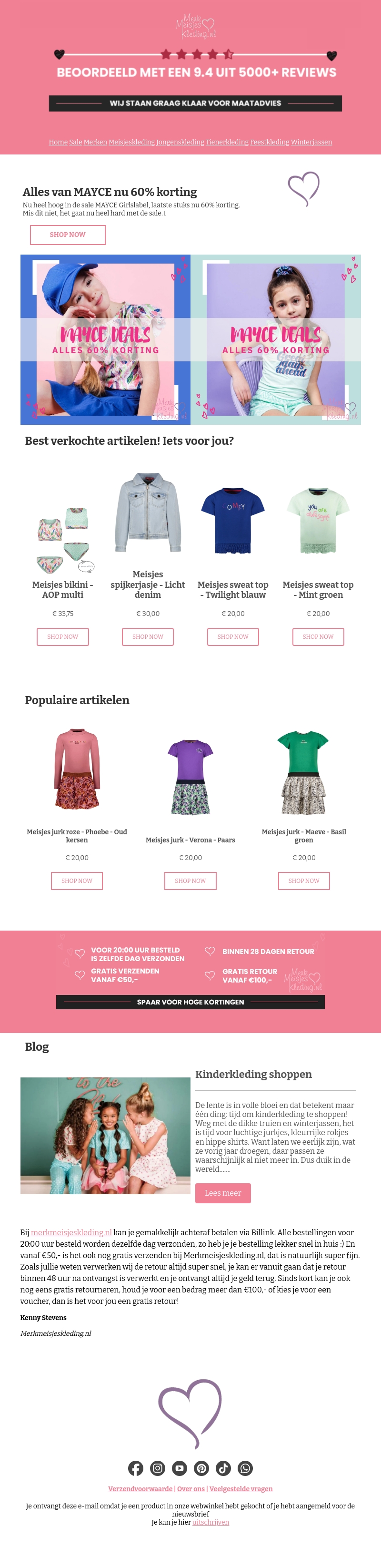 Beoordeld met een 9.4 uit 5000+ reviews, biedt Merkmeisjeskleding.nl nu een mega sale aan! Ontvang 60% korting op alle MAYCE artikelen. Haal nu de nieuwste outfits voor meisjes tegen spectaculaire prijzen. Mis deze kans niet, de voorraad is beperkt!