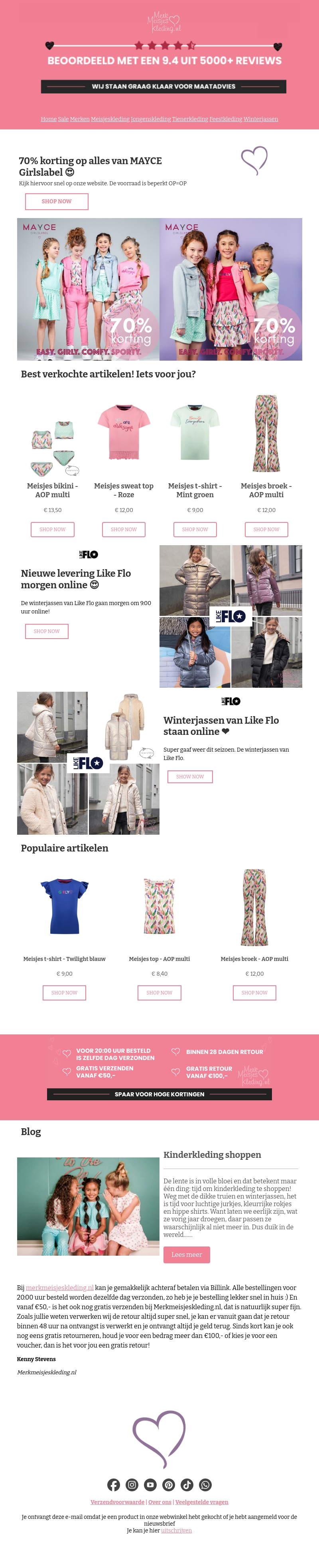 Maak gebruik van de 70% korting op alles van MAYCE Girlslabel! Snel, want de voorraad is beperkt. Nieuwe wintercollectie van Like Flo nu verkrijgbaar. Mis deze kans niet en shop de beste deals voor meisjeskleding!