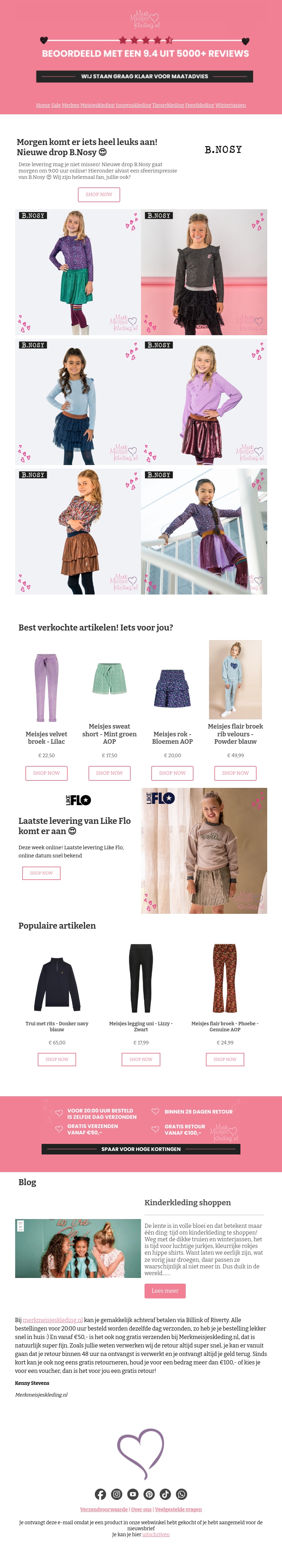 Morgen komt er een fantastische nieuwe levering van B.Nosy online! Ontdek de nieuwste trends en populaire artikelen voor meisjes. Van jurken tot truien, er is voor ieder wat wils. Daarnaast komt er ook een levering van Like Flo aan! Bekijk onze best verkochte items en mis deze kansen niet.