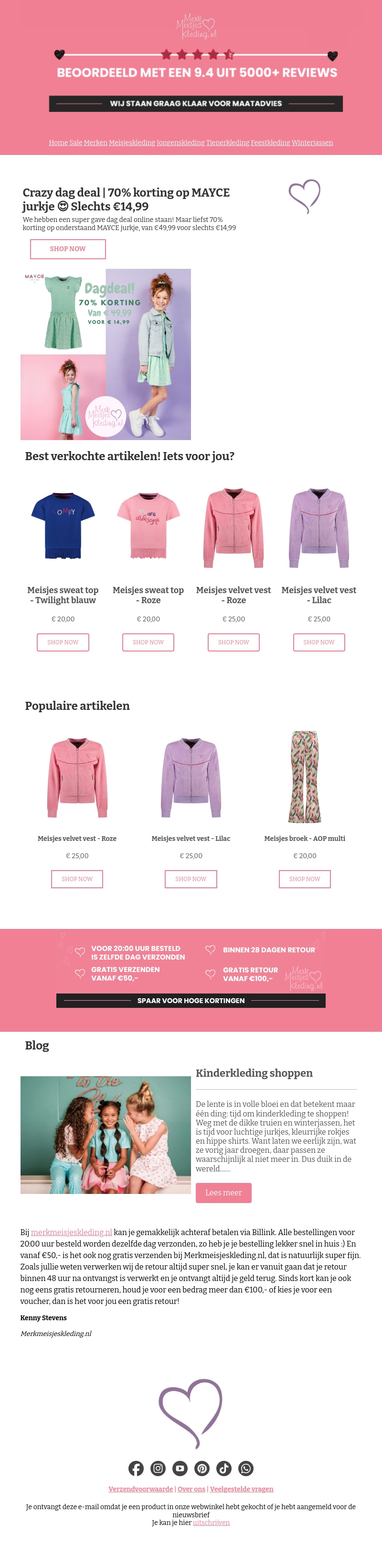 Beoordeld met een 9.4 uit 5000+ reviews, bieden wij een exclusieve 70% korting op het MAYCE jurkje! Nu slechts β¬14,99 in plaats van β¬49,99. Bekijk ook onze beste verkochte en populaire artikelen, en profiteer van snelle verzending en gratis retour bij bestellingen vanaf β¬100.