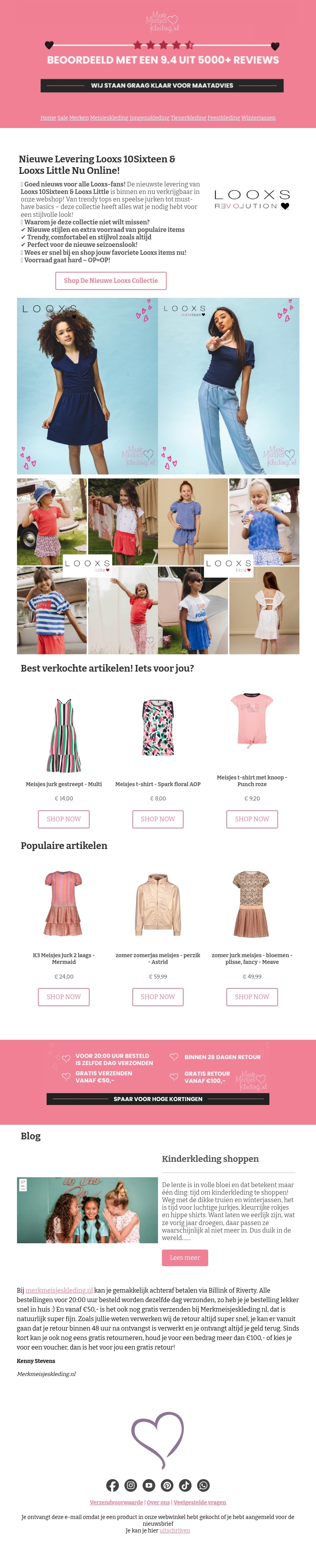 De nieuwste collectie van Looxs 10sixteen en Looxs Little is nu beschikbaar! Ontdek trendy basics en stijlen die elke garderobe opfleuren. Bestel vandaag nog jouw favorieten. Voor 20:00 besteld, dezelfde dag verzonden. Gratis verzending vanaf β¬50 en gratis retour vanaf β¬100. Spaar ook voor hoge kortingen!