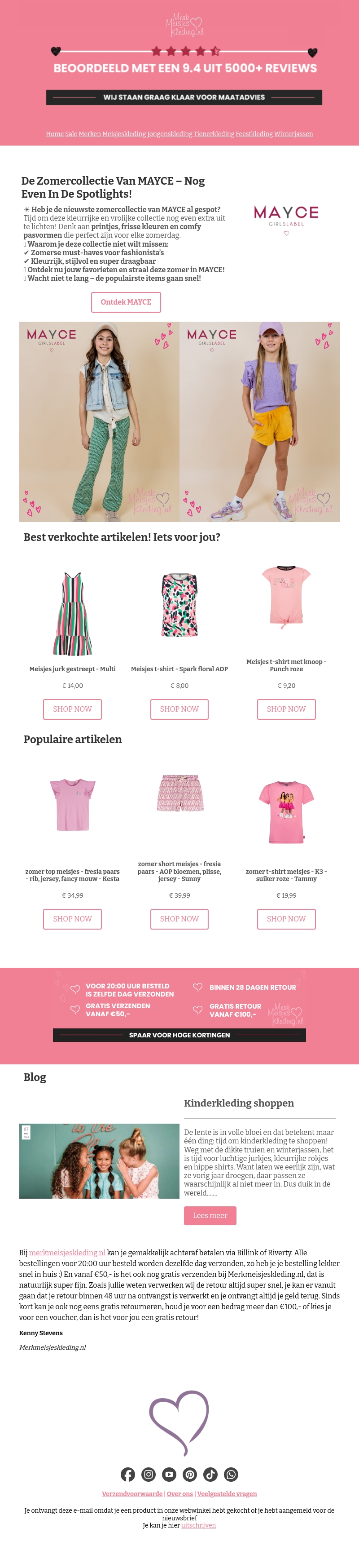 De nieuwste zomercollectie van MAYCE is gearriveerd en zit boordevol frisse kleuren en trendy designs. Van jurkjes tot t-shirts, deze collectie heeft alles voor warme zomerdagen. Profiteer van gratis verzending vanaf €50 en ontdek de best verkochte artikelen. Shop nu voor de populairste stijlen voordat ze uitverkocht zijn!