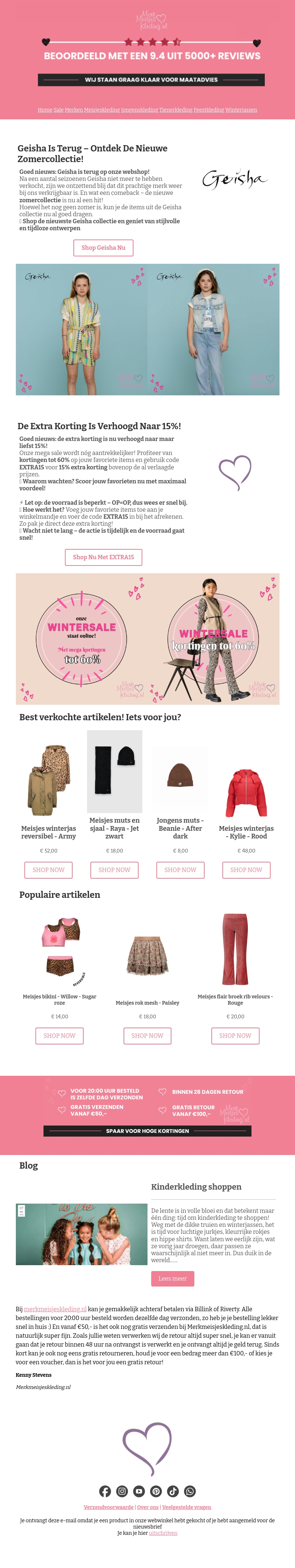Geisha is terug met een sprankelende zomercollectie. Ontdek de nieuwste stijlen en profiteer van aantrekkelijke kortingen. Shop nu en geniet van een korting tot 60%! Vergeet niet de extra 15% korting te gebruiken met de code EXTRA15. Bekijk de best verkochte items en de blog over kinderkleding.