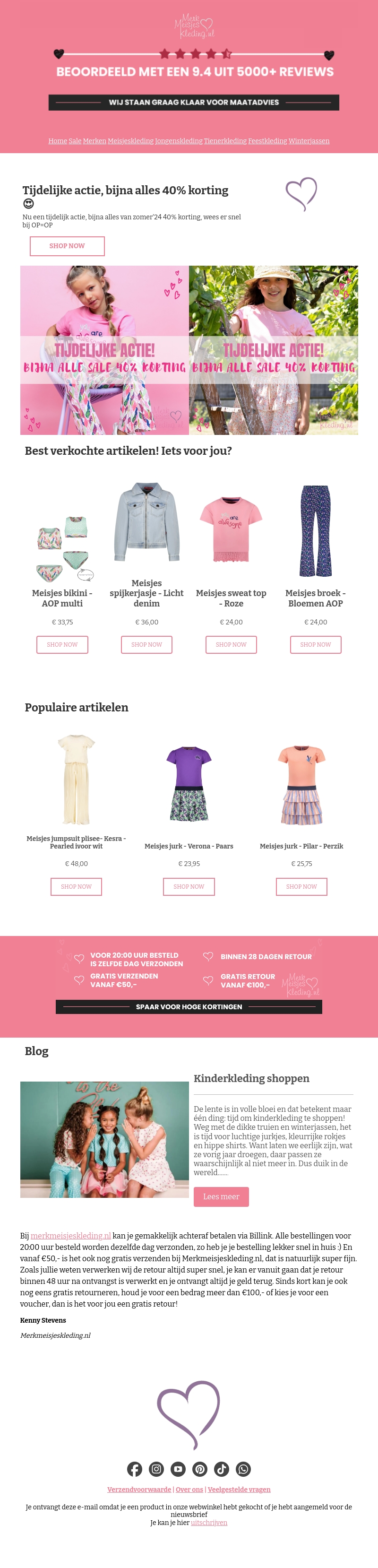 Ontdek onze tijdelijke actie met 40% korting op bijna de gehele zomer '24 collectie! Van meisjeskleding tot trendy outfits, we hebben alles wat je nodig hebt voor een stijlvolle zomer. Bestel voor 20:00 uur en ontvang je bestelling de volgende dag. Gratis verzending vanaf β¬50 en gratis retour vanaf β¬100. Mis het niet, want op=op!