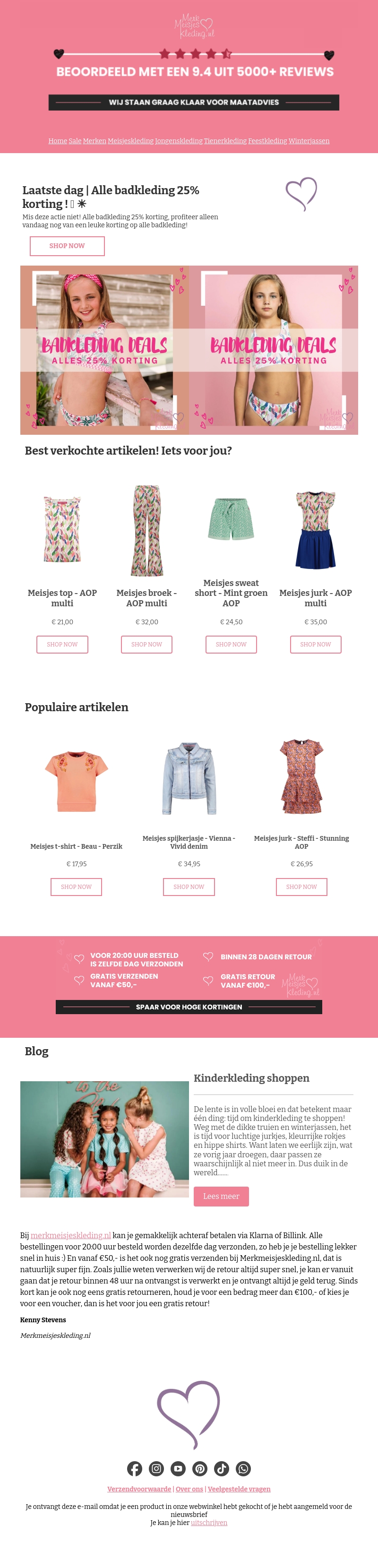Ontdek de laatste dag van onze geweldige actie met 25% korting op alle badkleding. Profiteer snel en shop je favoriete badkleding voor meisjes nu met korting. Bekijk ook onze best verkochte en populaire artikelen. Mis het niet!