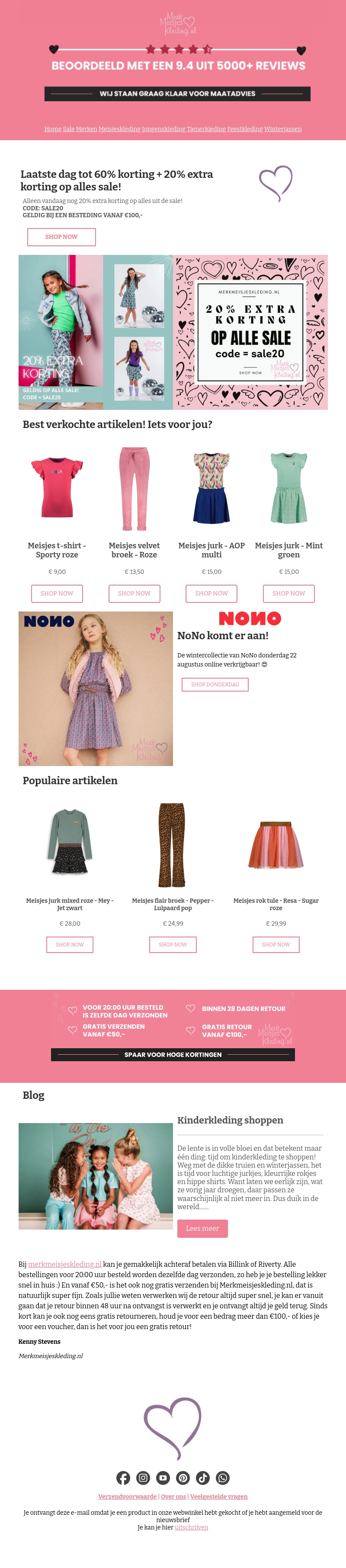 Alleen vandaag krijg je 20% extra korting op alles uit de sale bij Merkenmeisjeskleding.nl. Gebruik de code SALE20 en geniet van een geweldige besparing op meisjeskleding. De actie is geldig bij een besteding vanaf β¬100. Bekijk de best verkochte artikelen en populaire items in onze collectie!