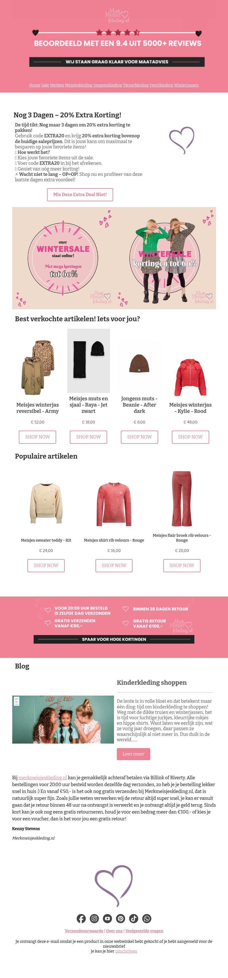 Nog slechts 3 dagen om te genieten van 20% extra korting op jouw favoriete items met code EXTRA20. Kies uit een breed assortiment winterkleding en accessoires voor meisjes. Mis deze kans niet om te besparen op populaire artikelen. Wees er snel bij en shop nu voordelig online. Bestel voor 20:00 uur en ontvang je bestelling morgen al in huis.