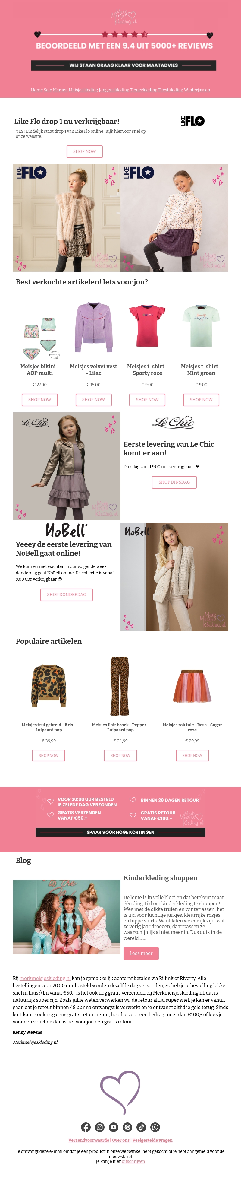De eerste drop van de Like Flo collectie is nu beschikbaar! Ontdek prachtige nieuwe kledingstukken, ideaal voor het aankomende seizoen. Van kleurrijke t-shirts tot stijlvolle jassen, er is voor ieder wat wils. Bekijk nu onze meest populaire artikelen en shop je favorieten. Mis ook de levering van Le Chic en NoBell niet! Gratis verzending vanaf β¬50.